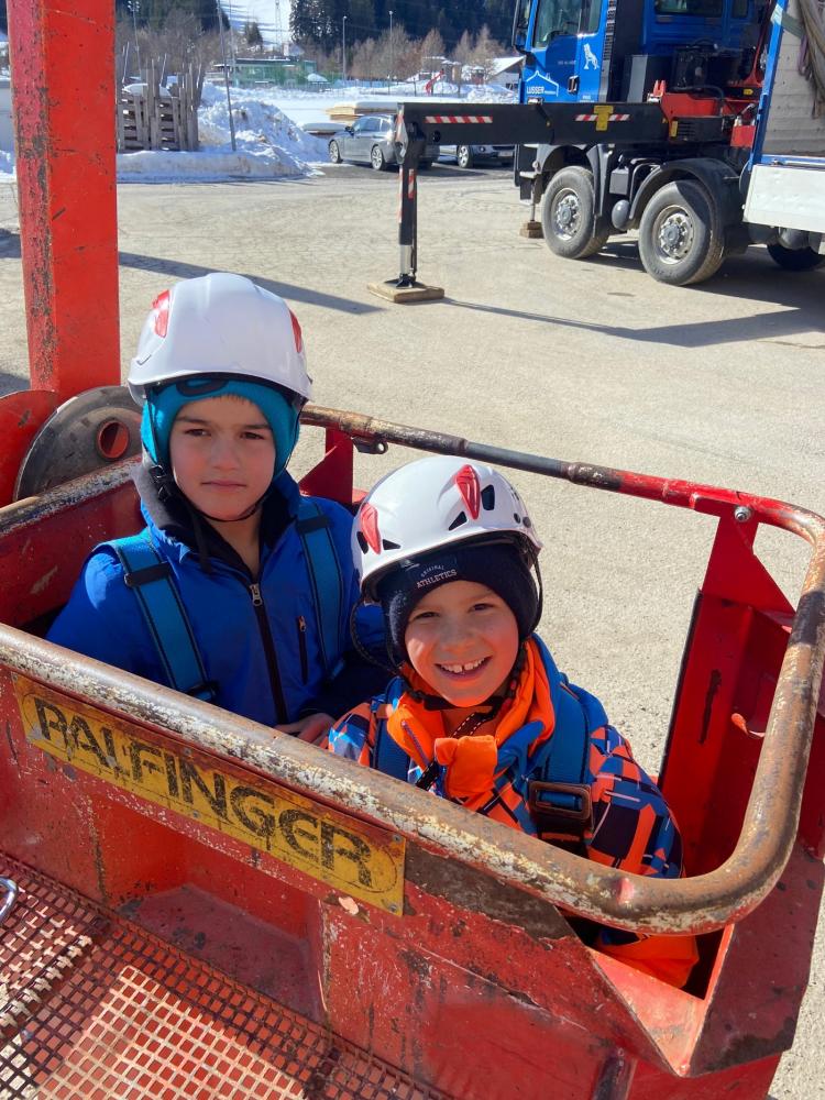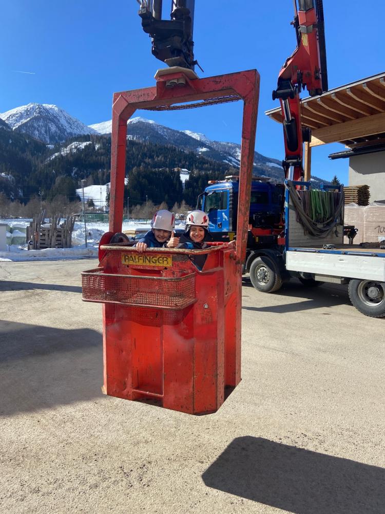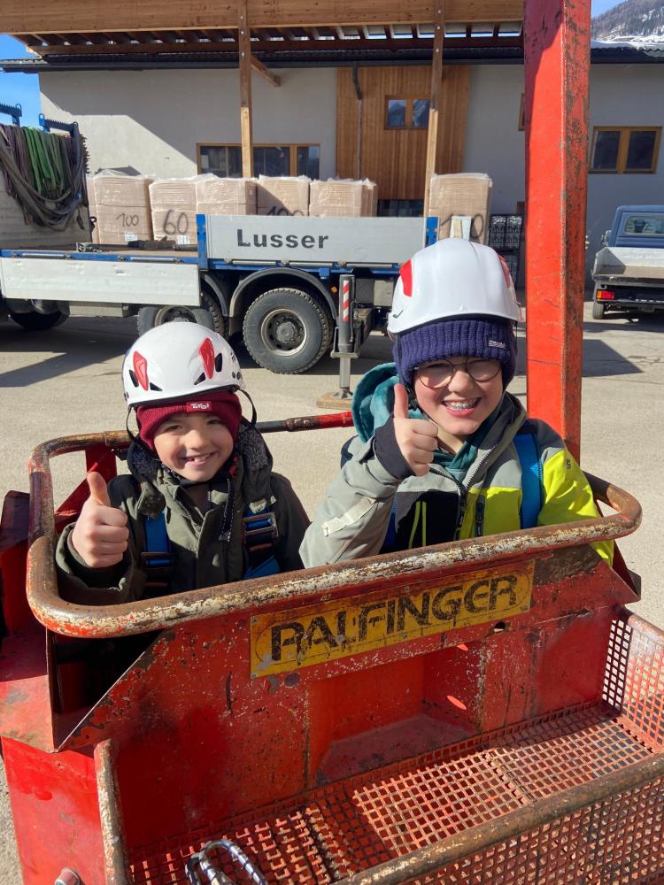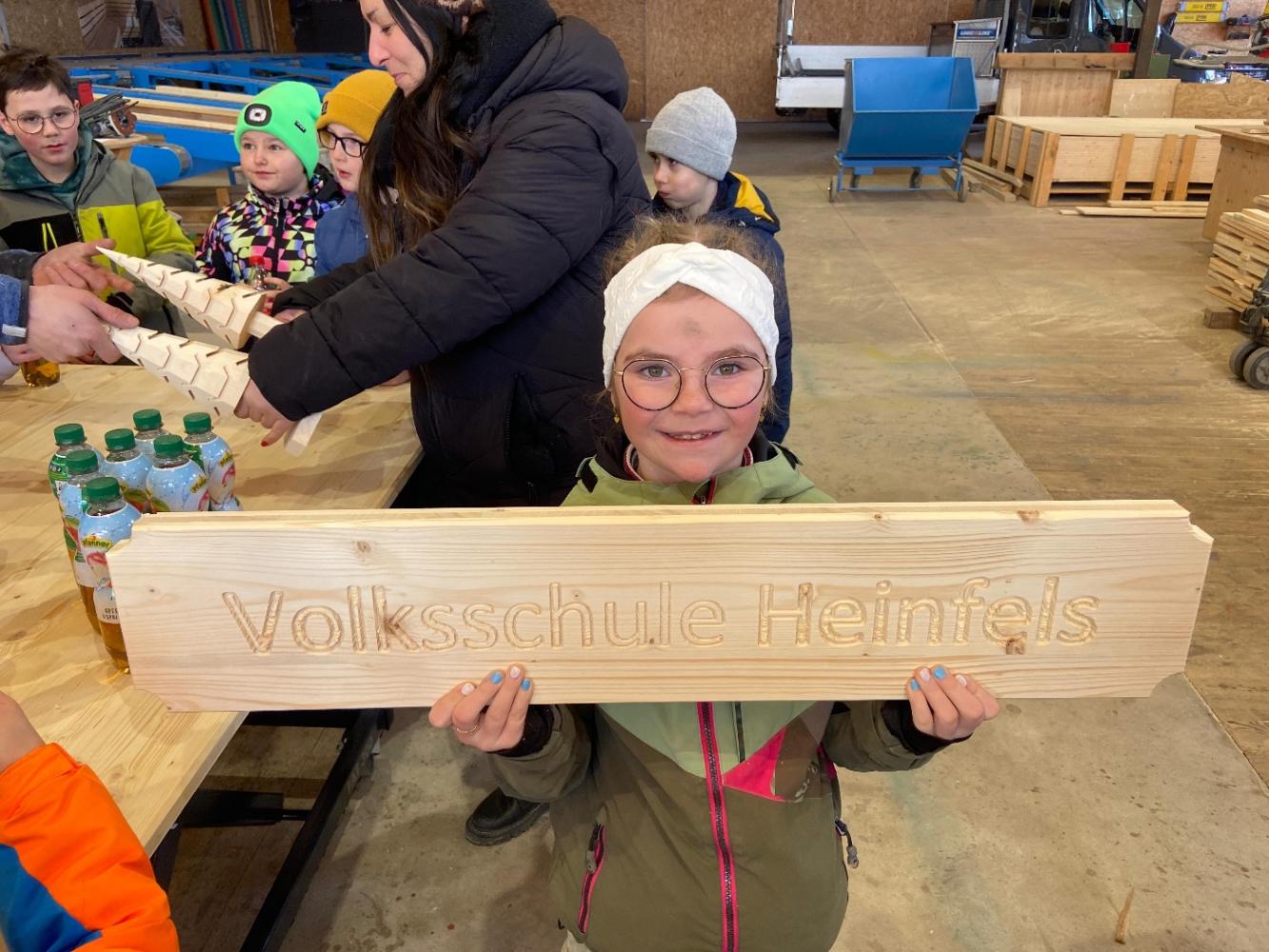 Ein absolutes Highlight war das Kranfahren in luftiger Höhe – ein unvergessliches Erlebnis für alle Beteiligten! Außerdem konnten die Kinder beobachten, wie an der Fräsmaschine Holz bearbeitet wird. Dabei entstand sogar ein eigenes Schild für die VS Heinfels, auf das wir besonders stolz sind.