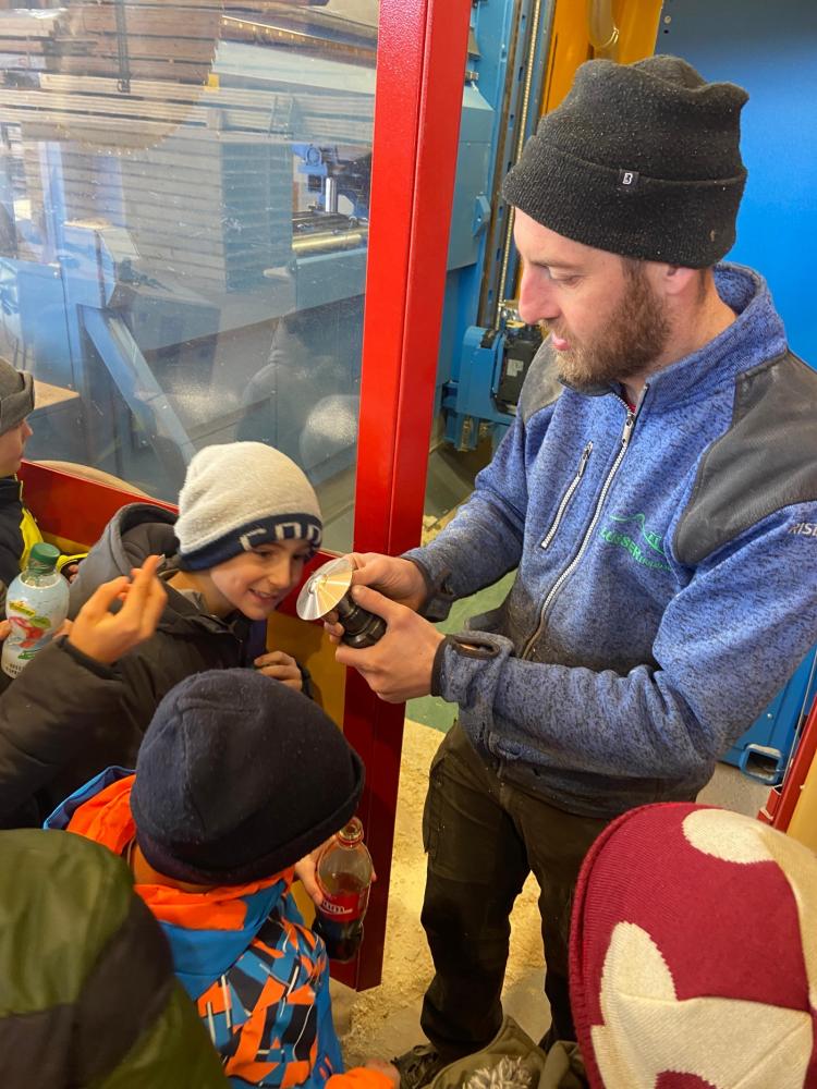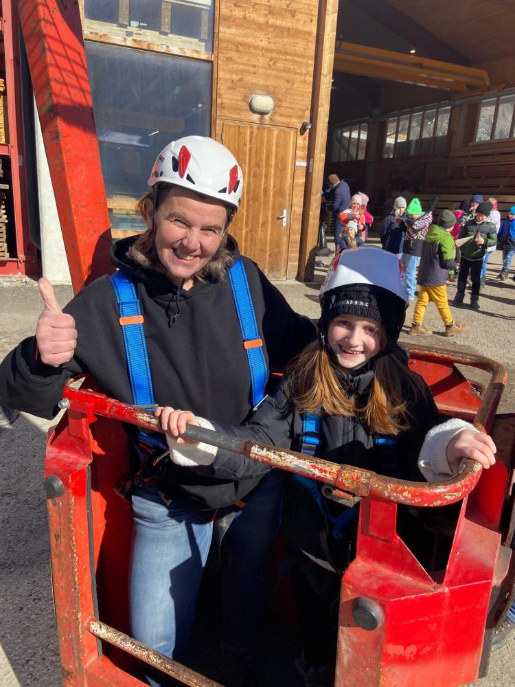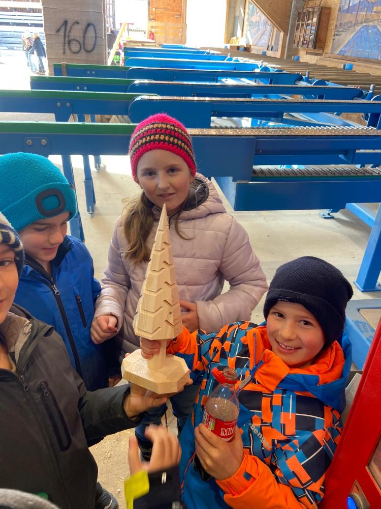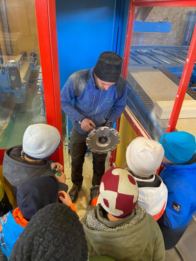 Ein absolutes Highlight war das Kranfahren in luftiger Höhe – ein unvergessliches Erlebnis für alle Beteiligten! Außerdem konnten die Kinder beobachten, wie an der Fräsmaschine Holz bearbeitet wird. Dabei entstand sogar ein eigenes Schild für die VS Heinfels, auf das wir besonders stolz sind.
